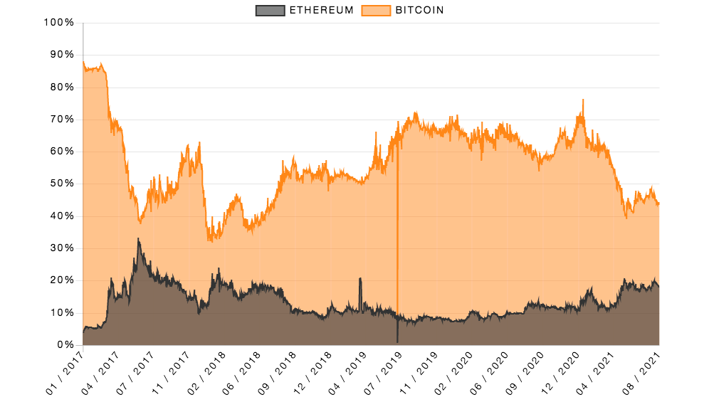 Сейчас доля ВТС на рынке — 44%, ЕТН — 18.1%. С начала года доминирование биткоина снизилось на 32%, а доля ЕТН выросла лишь на 5.5%.
