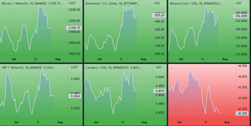 Динамика котировок BTC, ETH, BNB, SOL, XRP (дневной таймфрейм) и график доминации биткоина. Источник
