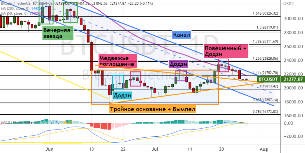 Котировки BTC консолидируются между поддержкой на уровне $21 000 и сопротивлением $21 800. Между этими уровнями также проходит верхняя граница модели теханализа «Нисходящий канал» (линии синего цвета) и линия 50-дневной простой скользящей средней (SMA).