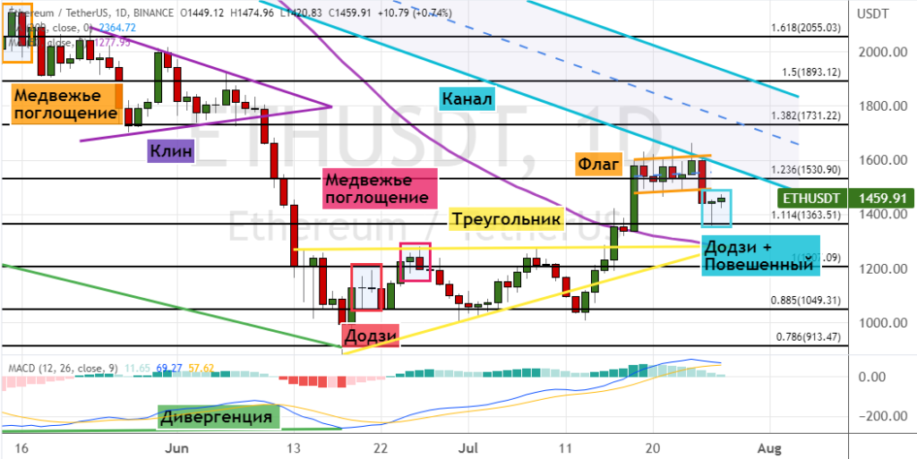 Закрытие дневных свечей выше $1 530, где также проходит нижняя граница модели теханализа «Нисходящий канал» (обозначена бирюзовым цветом) и верхняя граница возможно формирующейся модели «Флаг», станет сигналом о восстановлении краткосрочного бычьего тренда. Первые цели для быков расположены на уровне $1 600 и $1 730. Сохранение бычьей динамики приведет к формированию среднесрочного восходящего тренда, подтверждением которого станет рост стоимости эфира выше уровня $1 900 и границ кластера $2 000–$2 055. На возможную реализацию этого прогноза указывают модели теханализа «Флаг», «Бычье поглощение» и «Молот», а также прорыв верхней границы модели «Треугольник» и дивергенция между ценой ETH на графике и осцилляторе MACD. На графике ниже также можно отметить возможное формирование моделей «Додзи» и «Повешенный» (отмечены бирюзовым цветом).