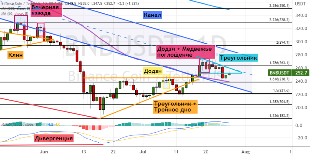 При этом падение котировок альткоина ниже границ кластера $240–$250, где также проходит граница модели теханализа «Треугольник» (обозначена оранжевым цветом), линия 50-дневной SMA и нижняя граница модели теханализа «Нисходящий канал» (обозначена синим цветом), станет сигналом о развитии медвежьей динамики. В краткосрочной перспективе это может привести к падению BNB до первых целей $220 и $205. В пользу восстановления медвежьего тренда указывают сигналы в виде преодоления нижней границы модели теханализа «Треугольник», а также модели «Додзи» и «Медвежье поглощение» (обозначены фиолетовым цветом), «Повешенный», «Додзи», две модели «Вечерняя звезда» и пробитие границ «Нисходящего канала» (обозначены синим цветом) и «Клина» (обозначены оранжевым цветом).