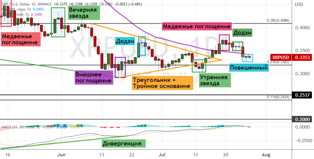 При этом закрытие дневных свечей ниже уровня $0.32 станет сигналом о развитии краткосрочной медвежьей динамики. Первой целью в таком случае выступит уровень $0.3. Дальше котировки XRP направятся к границам кластера $0.24–$0.25 и к уровню $0.2. В пользу развития такого сценария торгов указывают восемь сигналов теханализа: две модели «Додзи», «Медвежье поглощение» (обозначена розовым цветом на графике ниже), пробитие нижней границы модели теханализа «Клин», а также модели теханализа «Перевернутый молот» и несколько свечных комбинаций — «Додзи», «Вечерняя звезда» и «Медвежье поглощение».