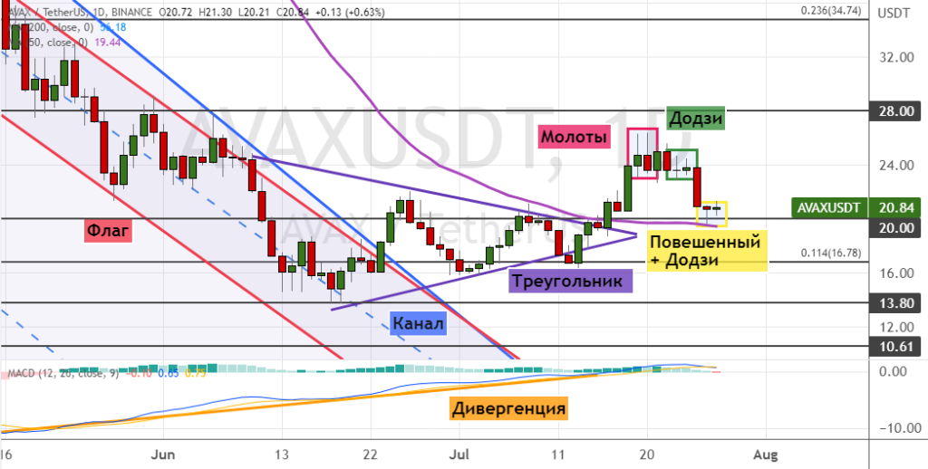Закрытие дневных свечей выше уровня $24 станет сигналом о восстановлении восходящей динамики. В таком случае краткосрочный бычий тренд позволит котировкам AVAX подняться до уровней $28, $34.80 и $40. В пользу развития этого сценария торгов указывает возможное формирование моделей «Додзи» и «Повешенный» (отмечены желтым цветом) и четыре сигнала теханализа: преодоление верхних границ моделей теханализа «Флаг», «Канал» и «Треугольник», а также бычья дивергенция между ценой на графике и осцилляторе MACD.