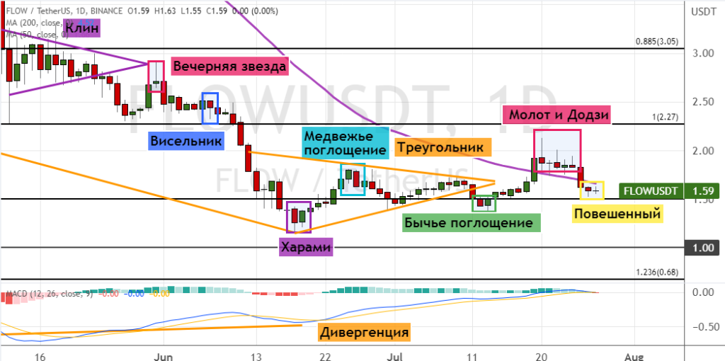 Если котировки актива опустятся ниже уровня поддержки $1.5, то дальше он направится в район нижней границы консолидации $1.2–$1.5. Более глубокая коррекция приведет к падению FLOW до уровней $1 и $0.7. В пользу развития краткосрочной нисходящей динамики указывают четыре сигнала: прорыв нижней границы модели теханализа «Треугольник» и модели «Медвежье поглощение», «Вечерняя звезда» и возможно формирующаяся модель «Молот».