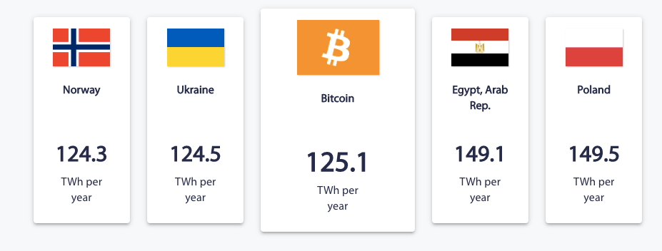 Примечательно, что сейчас Bitcoin потребляет меньше энергии, чем год назад — тогда на поддержание работоспособности сети уходило около 150 ТВт·ч. Впрочем, и нынешние 125.13 ТВт·ч — это тоже немало. Например, это больше годового потребления энергии таких стран, как Норвегия и Украина.