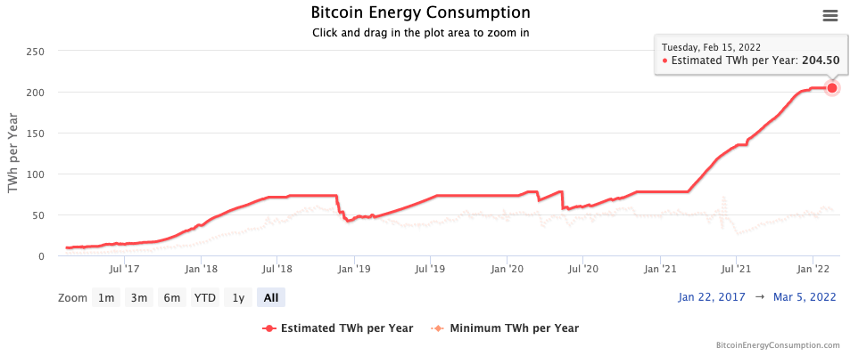 По оценкам Кембриджского центра альтернативного финансирования (CCAF), сеть первой криптовалюты потребляет от 49.31 ТВт·ч до 291.58 ТВт·ч. А в среднем данный показатель составляет 125.13 ТВт·ч. Это около 0.56% от всего электропотребления мира по статистике за 2019 год. Для сравнения: на интернет уходит до 10% всей электроэнергии мира, а на YouTube и Netflix — 1%.