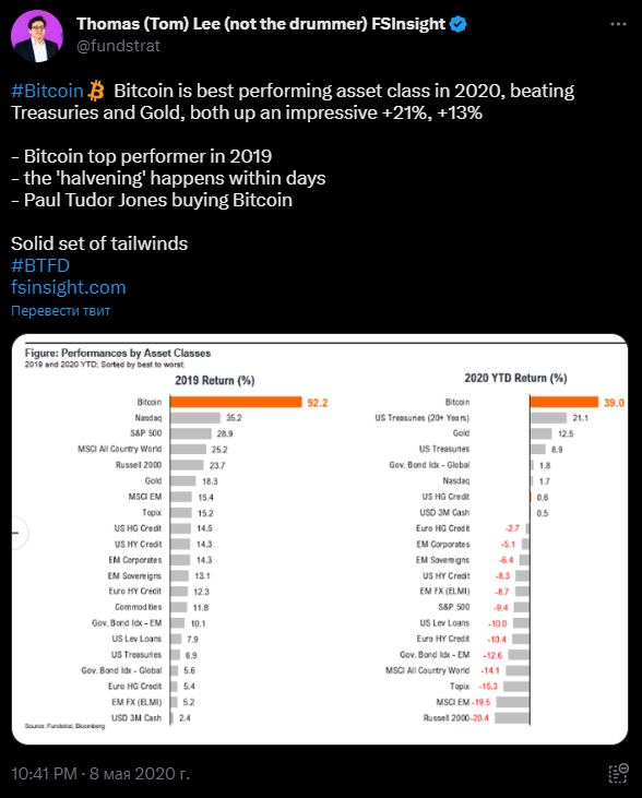 «Биткоин является самым эффективным классом активов в 2020 году, опережая казначейские облигации и золото, которые выросли на впечатляющие +21%, +13%. Биткойн топ-актив в 2019 году, халвинг случится на днях, Пол Тюдор Джонс [легендарный трейдер] покупает биткоин — надежный набор попутных ветров», — написал еще в мае сооснователь аналитической фирмы Fundstrat Тома Ли.