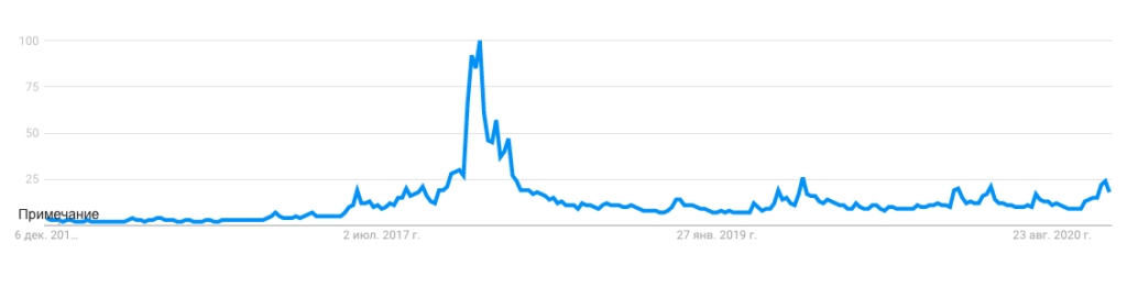 График поискового запроса «bitcoin» по данным Google Trends. В 2017 году биткоин гуглили в 4 раза чаще, чем сегодня. Источник.