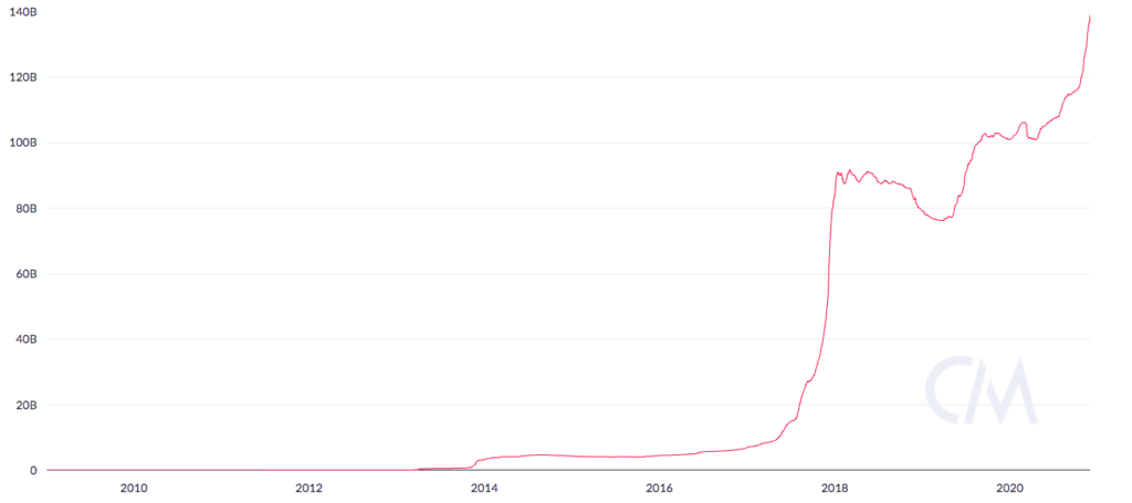 График реализованной капитализации по данным Coin Metrics. Реализованная капитализация —  показатель, который оценивает стоимость ликвидных (доступных для торговли) биткоинов, то есть за вычетом тех, которые не перемещались с кошельков несколько лет. Реализованная капитализация сегодня составляет $129 млрд, что значительно выше ее пика в $90 млрд в начале 2018 года. Это говорит о том, что биткоин сейчас значительно более ликвиден, а инвесторы менее охотно его продают. Источник.