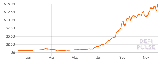 График количества средств, заблокированных в DeFi-протоколах, по данным DeFi Pulse. Сейчас в них  заблокировано свыше $14,17 млрд — в 22 раза больше, чем год назад. Источник.