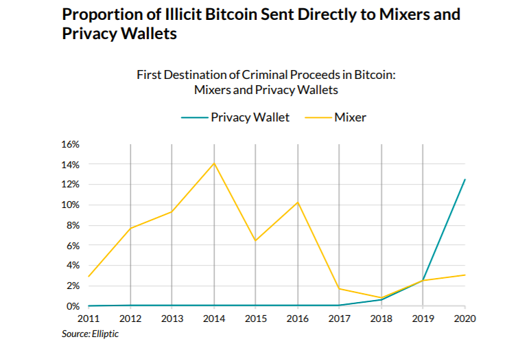 С одной стороны, компания обнаружила, что использование биткоинов в криминальных целях (по сравнению с другими способами использования) в этом году резко снизилось. С другой стороны, это может быть связано со слишком эффективной работой CoinJoin-миксеров, встроенных в приватные кошельки. По данным Elliptic, с 2018 года популярность таких кошельков среди преступников растет по сравнению с централизованными миксерами. Так, в 2020 году 13% всех биткоинов, отправленных в приватные кошельки, были связаны с преступными действиями, тогда как доля таких монет, отправленных в миксеры, упала до 3%: