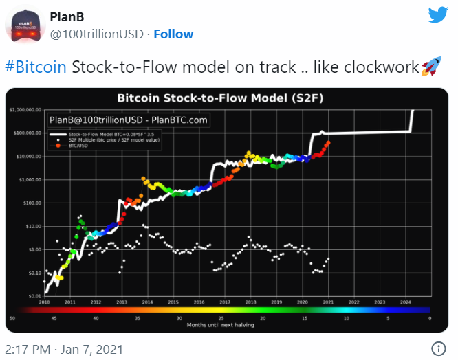 В 2019 году PlanB предсказывал, что вскоре после третьего халвинга, который прошел в мае 2020-го, цена биткоина за одни-два года достигнет отметки $55 000 при капитализации в $1 трлн. Тогда это оказалось излишне оптимистичной оценкой, но после мощного роста биткоина до $42 000 уже кажется перспективой ближайшего будущего.