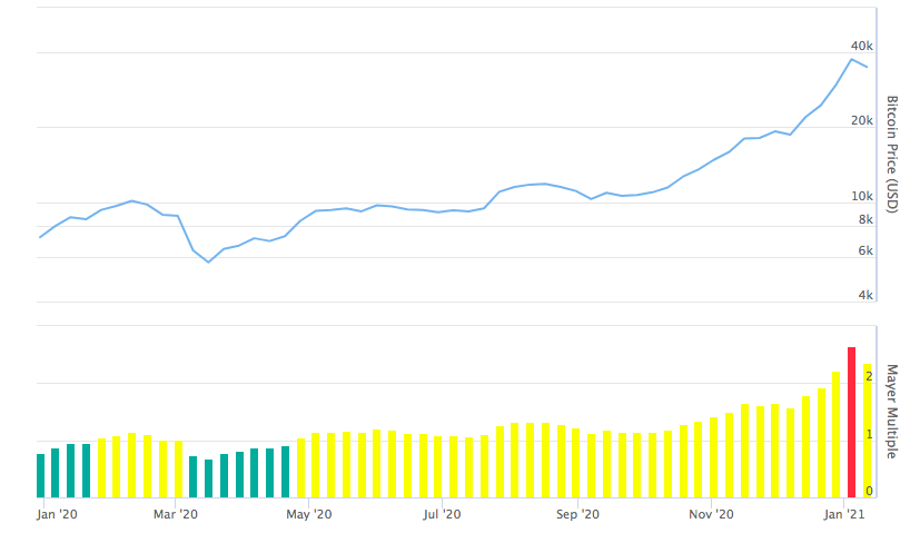 Множественная модель Майера (Mayor Multiple model) была разработана и популяризирована ранним биткоин-инвестором и менеджером хедж-фонда Трейсом Майером. Это индикатор, учитывающий соотношение нынешней цены ВТС со средней ценой за 200 дней. Его задача — показать лучшие времена для покупки или продажи биткоина, а также определить уровень перекупленности или дно рынка.