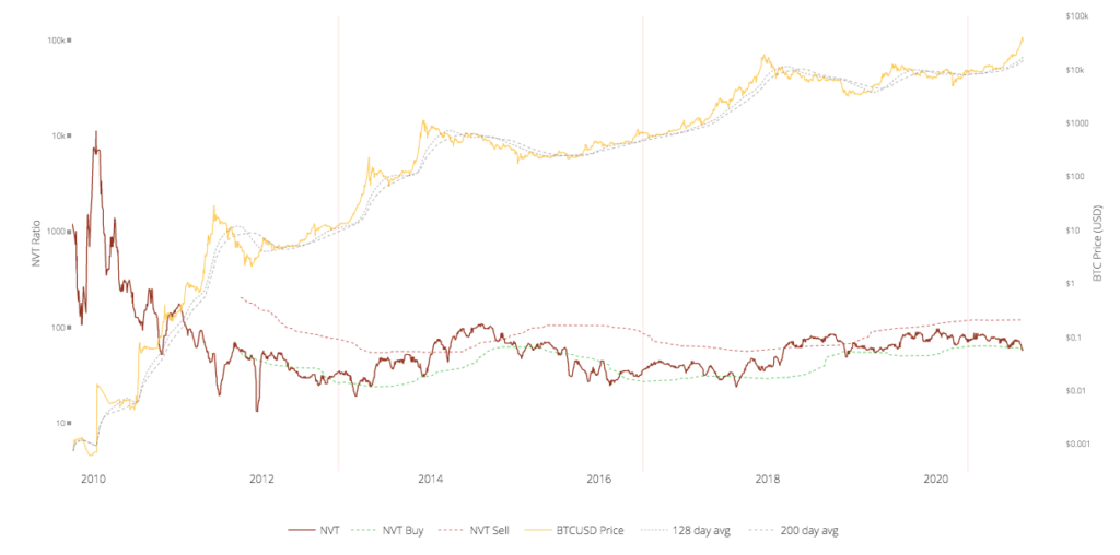 Коэффициент NVT (Network Value to Transactions Ratio) выражает отношение рыночной капитализации к объему транзакций в сети. Это аналог отношения P/E (цена к прибыли) на фондовом рынке. Модель придумал и популяризирует аналитик и крипто-инвестор Вилли Ву. Она помогает обнаружить пузырь и определить возможности для покупки.