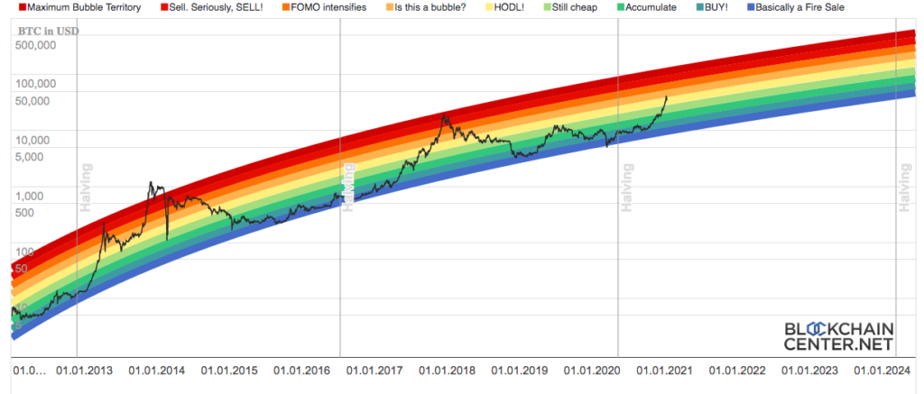 Радужный график биткоина (Bitcoin Rainbow Chart) — логарифмический график движения цены биткоина, помогающий ориентироваться в восходящем или нисходящем направлении курса монеты.