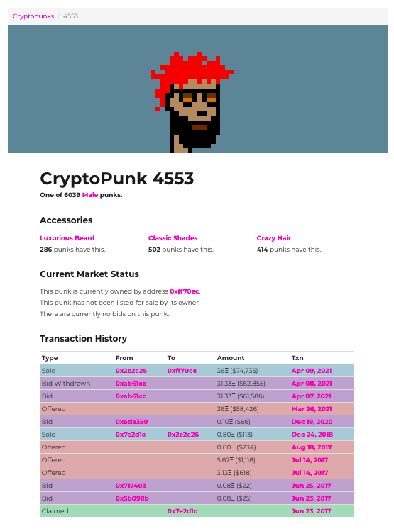Страница криптопанка 4553. Обратите внимание, как выросла его стоимость за 4 года. Источник