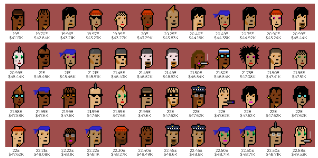 Самый дешевый персонаж CryptoPunks сейчас стоит 19.99 ЕТН — $42 927. Средняя цена проданных криптопанков за последний год — 16.44 ETH, или около $35 295.