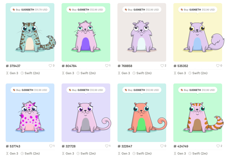 В то же время NFT становилось все больше, что также подогревало рынок. В конце 2017 года компания Dapper Labs запустила CryptoKitties — коллекционную игру, в которой пользователь мог покупать, продавать и скрещивать блокчейн-котиков. У каждого криптокота есть уникальные характеристики: чем они реже, тем он дороже. За любое действие в игре надо платить в эфире, а разработчики проекта получают процент с каждой транзакции. CryptoKitties произвели кратковременный фурор: игра перегружала сеть Ethereum, котики продавались по сотни тысяч долларов. Но хайп быстро закончился, и сейчас большинство из них стоят от пары центов до нескольких десятков долларов.