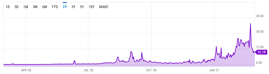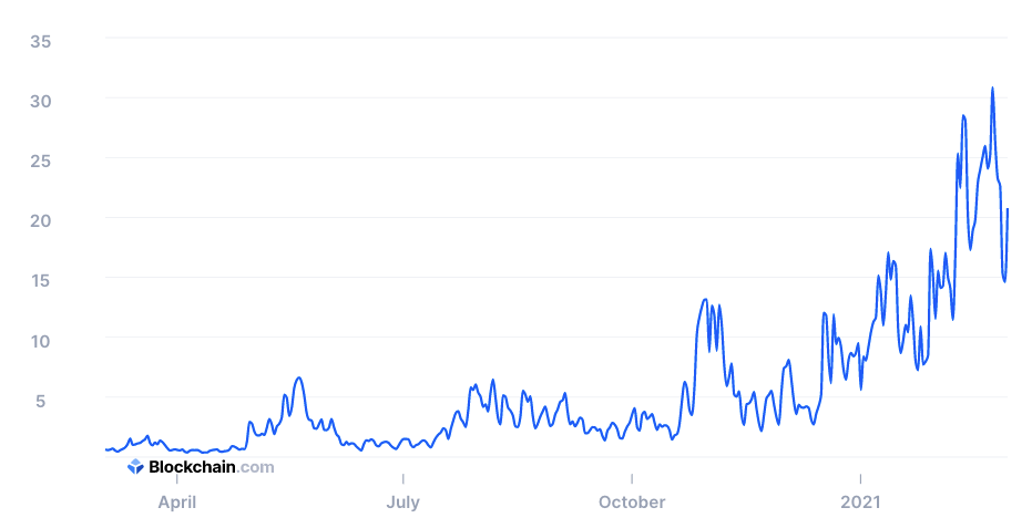 За последний год эфир подорожал в 7 раз (на пике — почти в 9 раз), при этом комиссии в сети Ethereum выросли в 90 раз (на пике — в 300 раз). Так, в феврале комиссия за транзакцию в эфире составляла в среднем от $15 до $20. На транзакционные сборы приходится до 40% прибыли майнеров сети Ethereum. Поэтому добывать эту монету все еще прибыльно.