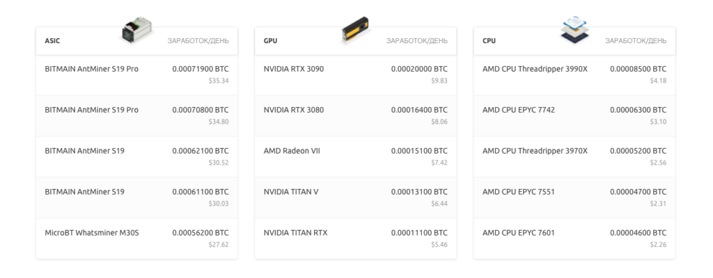 Вот доходность майнинга нескольких топовых устройств при курсе ВТС в $8 764 с учетом расходов на электроэнергию в 3.2 ₽/кВт⋅ч: