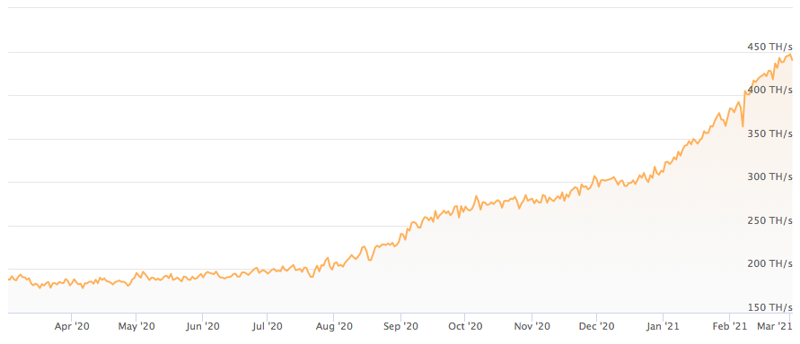 За год хешрейт сети Ethereum, то есть показатель необходимой мощности оборудования для майнинга, вырос с 187 TH/s до 440 TH/s. Это значит, что к сети Ethereum подключаются новые майнеры.