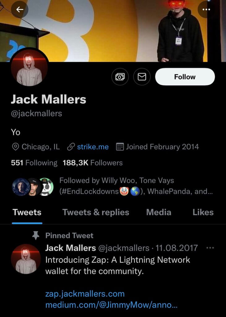 1. В iOS-приложении перейдите в профиль пользователя. Мы выбрали главу платежного сервиса Strike Джека Маллерса. Нажмите на значок денег слева от кнопки «Подписаться» (Following).