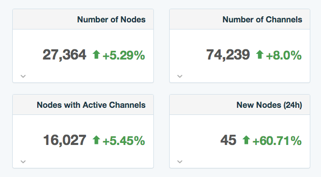 Статистика Lightning Network (слева направо и сверху вниз, общее количество и прирост за последние 30 дней): общее количество нод, общее количество каналов, ноды с активными каналами, новые ноды. Источник