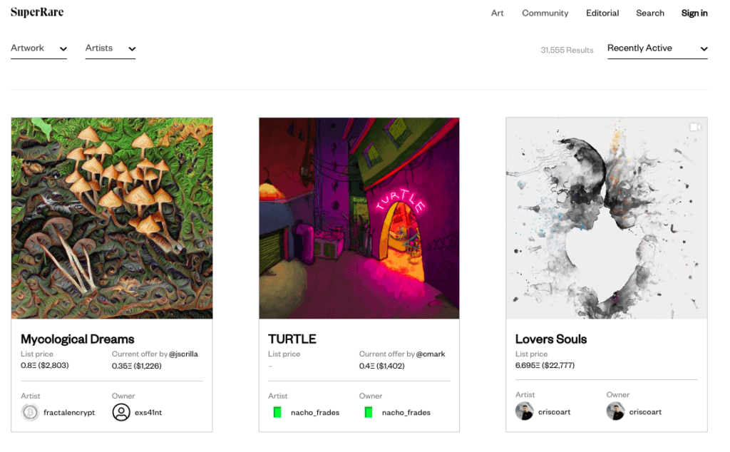 SuperRare — площадка для произведений лучших цифровых художников. Платформа сама приглашает самых известных из них, а непопулярному автору, скорее всего, откажут в размещении NFT. Комиссия с первой продажи — 15% в пользу платформы, с перепродаж — 10% в пользу создателя (аналог роялти). Еще более премиален Nifty Gateway, который также взимает 15% со всех сделок, из которых 5% направляется сервису, а 10% — создателю NFT. Nifty Gateway выбирают популярные цифровые художники. Например, на этой платформе размещены работы певицы и художницы Grimes.