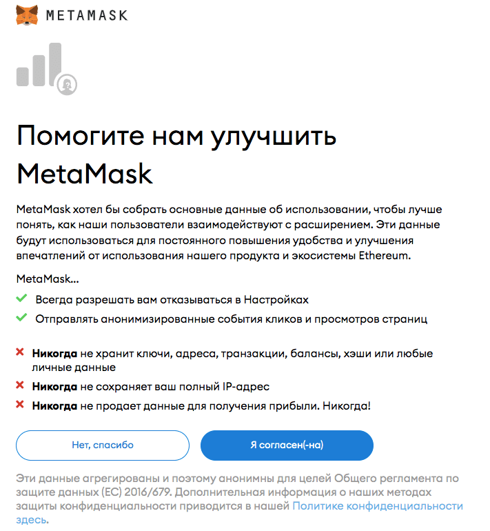 - Согласитесь с Политикой конфиденциальности MetaMask: