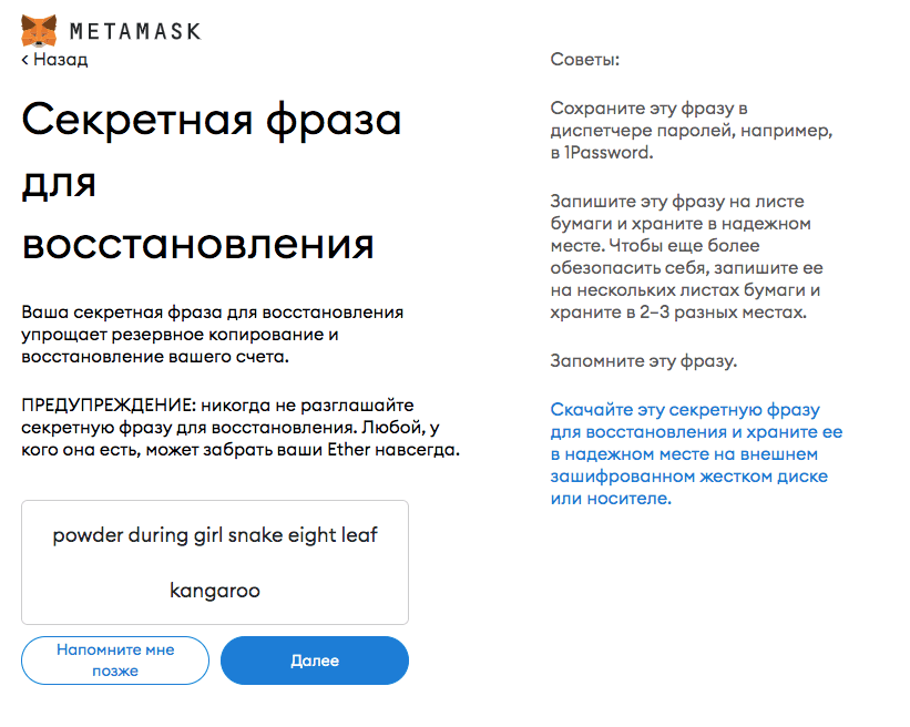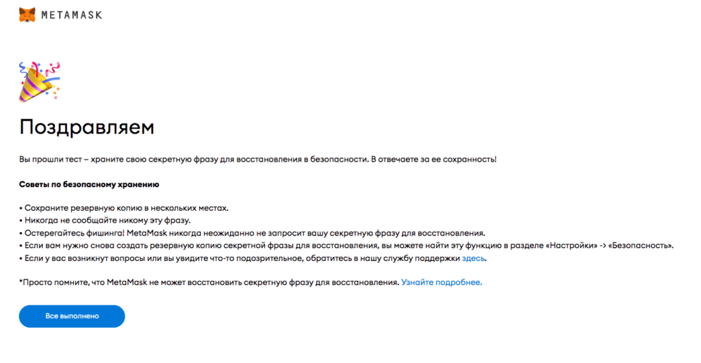 Очень важно сохранить пароль и seed-фразу (секретная фраза для восстановления). Они понадобятся, чтобы войти в кошелек с другого браузера или устройства. Без пароля и seed-фразы вы навсегда потеряете доступ к кошельку и ко всем активам в нем.