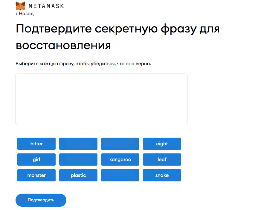 - Подтвердите секретную фразу для восстановления: