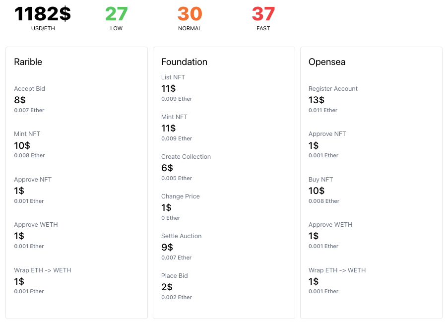 Например, в Ethereum для комиссий используется газ (Gas) — особая единица измерения для расчета стоимости подтверждения транзакции. Стоимость газа постоянно изменяется в зависимости от загруженности сети. Рассчитать размер комиссии можно на специальных сервисах, таких как Ethereumprice.org или Gwei.at.