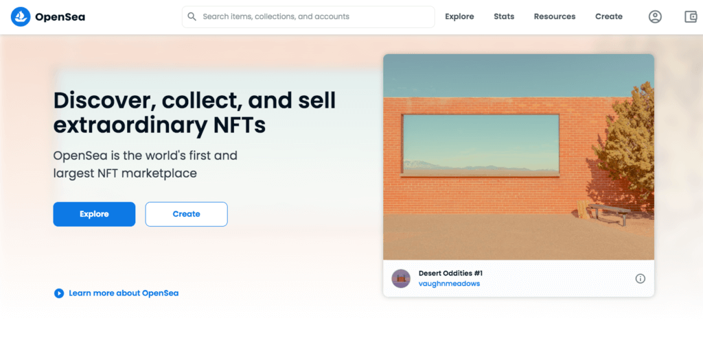 OpenSea работает на блокчейнах Ethereum, Polygon и Klaytn. Комиссия маркетплейса — 2.5% с каждой перепродажи.