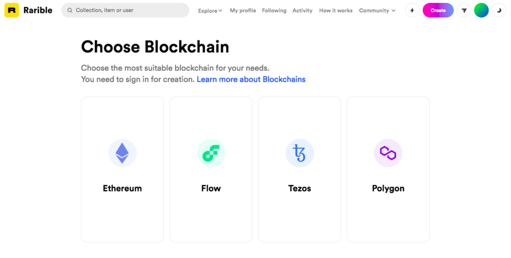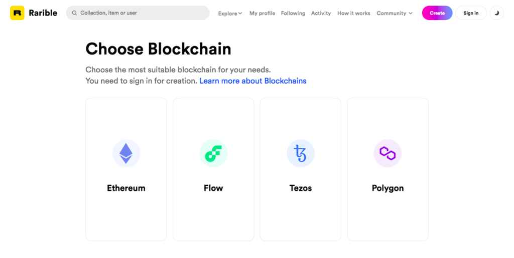 - Зайдите на сайт Rarible (https://rarible.com/), нажмите «Создать» (Create) и выберите блокчейн (например, Ethereum):