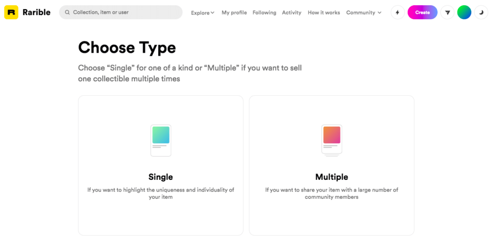 - Выберите тип NFT: в единственном числе или ограниченной серией (в нашем случае это единственный токен):