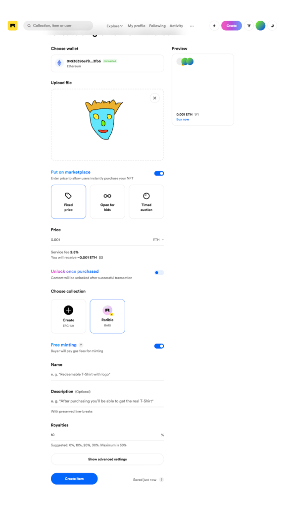 OpenSea и Rarible позволяют создавать NFT на Ethereum, ничего не оплачивая заранее. Когда покупатель приобретет токен, плата за его запись в блокчейн будет включена в стоимость передачи прав покупателю. Это поможет вам избежать лишних расходов в том случае, если NFT никто не купит.