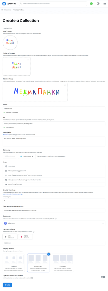 Для этого нажмите Create Collection и заполните все поля: загрузите логотип коллекции и обложки, придумайте название и краткое описание, добавьте ссылки на свой сайт или соцсети, выберите размер роялти от перепродаж (до 10%), а также блокчейн. Нажмите Create — и коллекция готова.