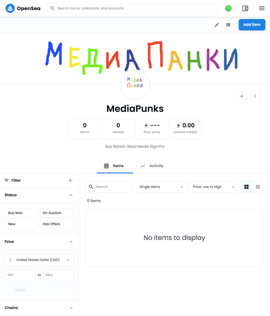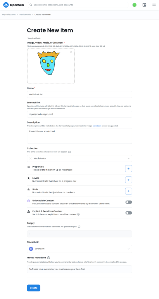 Чтобы создать NFT на OpenSea, надо действовать по такому же алгоритму. Но есть несколько нюансов. Токен должен быть частью какой-то коллекции, то есть сначала нужно создать ее.
