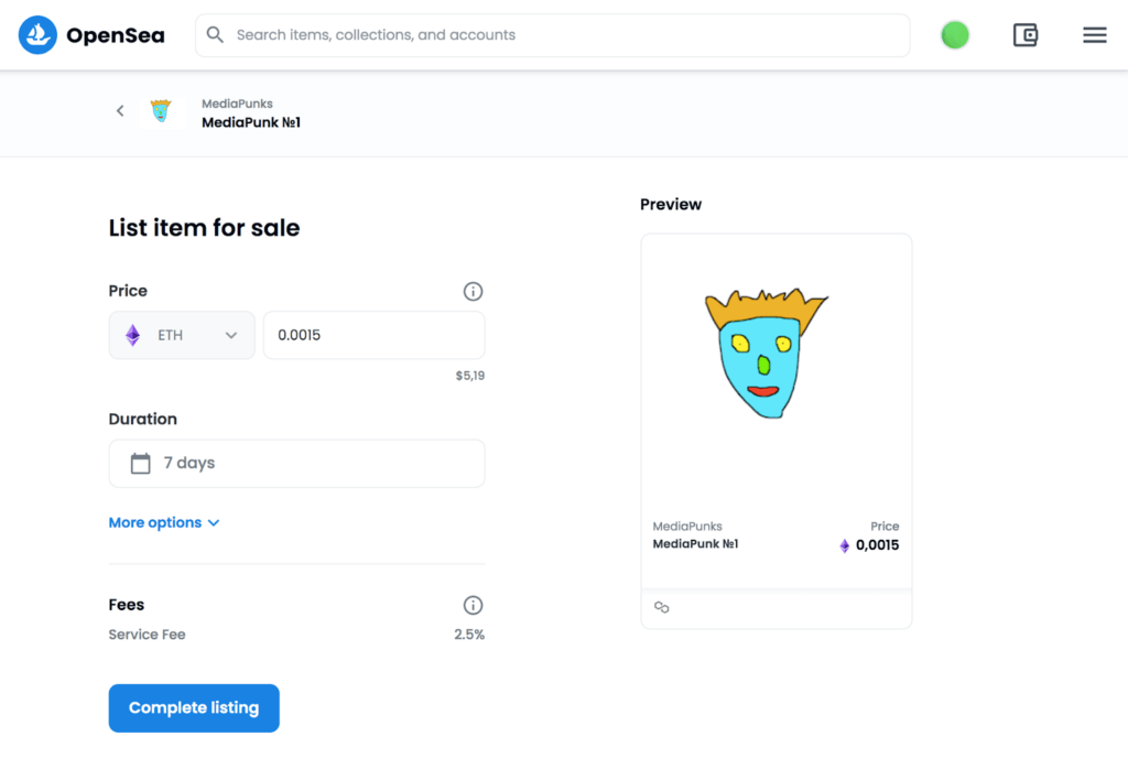 Но есть нюансы. Например, в OpenSea эта услуга доступна только для тех, кто уже инициировал свой кошелек, то есть провел первую транзакцию. После этого можно выставлять токены на продажу без предварительной оплаты за перенос в блокчейн.