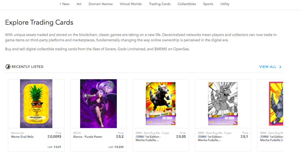 Страница с коллекционными карточками на OpenSea — самой популярной платформе для торговли цифровыми активами, где продаются игровые предметы, произведения цифрового искусства, доменные блокчейн-имена и коллекционные токены. Источник