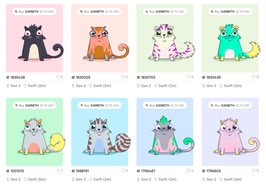 В конце 2017 вокруг CryptoKitties был огромный ажиотаж: пользователи готовы были платить за котиков десятки тысяч долларов, а игра заняла 15% трафика Ethereum, сильно перегрузив сеть. Но хайп быстро прошел. Сейчас у CryptoKitties  ежедневно появляется несколько сотен новых пользователей (против 15 000 человек на пике), а большинство котиков стоят всего пару центов, вместо сотен тысяч долларов (самый дорогой криптокотик был продан за 600 ETH, или $170 000 по тогдашнему курсу).