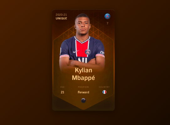Изображение NFT-карточки Килиана Мбаппе на платформе Sorare, позволяющей футбольным фанатам собирать и торговать цифровыми картами в виде невзаимозаменяемых токенов, собирая «команду мечты». Источник
