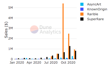 По данным Dune Analytics, ежемесячный объем продаж в NFT-секторе только летом превысил $1–3 млн, достигнув пика в $6 млн в сентябре этого года. Однако, по заявлениям арт-площадки SuperRare, только в октябре они продали цифровых произведений на сумму свыше $4.34 млн.