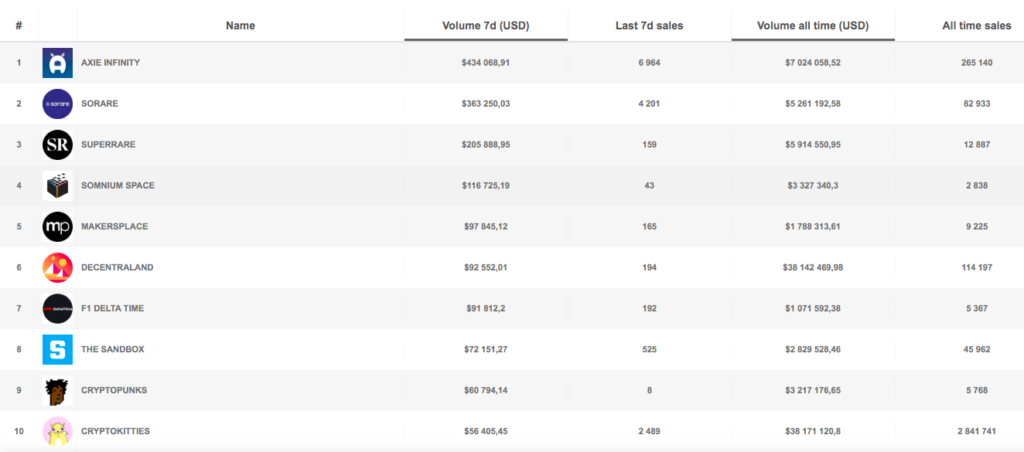 10 самых популярных NFT-проектов по данным NonFungible.com. Источник