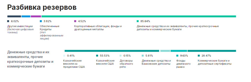 В то же время структура резервов USDC постоянно меняется. Согласно отчету за май 2021 года, на фиатные валюты приходился 61% резерва, а 39% — на долговые бумаги. В октябре стейблкоин был обеспечен уже на 100% фиатной валютой. Сейчас, судя по информации на сайте компании, большая часть средств вложена в долговые бумаги.