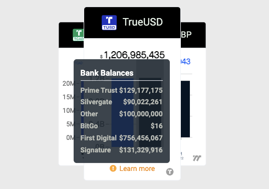 Обеспечение. Trust Token не сообщает структуру резервов своего стейблкоина. Долларовый баланс компании хранится в банках США и Гонконга. При этом резерв TUSD также состоит из эквивалентов денежных средств — неназванных «краткосрочных высоколиквидных долговых бумаг с достаточным кредитным рейтингом». Они хранятся в депозитарных учреждениях, находящихся за пределами США. За соответствие обеспечения отвечают пять крупных банков и компаний-партнеров, включая Silvergate Bank, BitGo и Signature Bank среди прочих. Данные о резервах компании проверяет одна из крупнейших бухгалтерских фирм в США — Armanino. Они доступны в реальном времени на сайте фирмы.