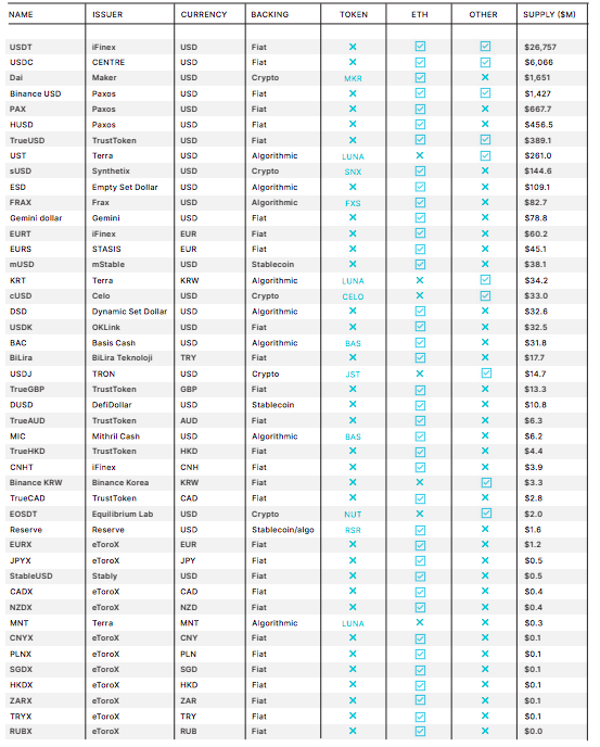По данным The Block Research, в феврале 2021 года на крипторынке обращалось около 200 различных стейблкоинов. Из них 50 крупнейших по капитализации были выпущены 25 компаниями.