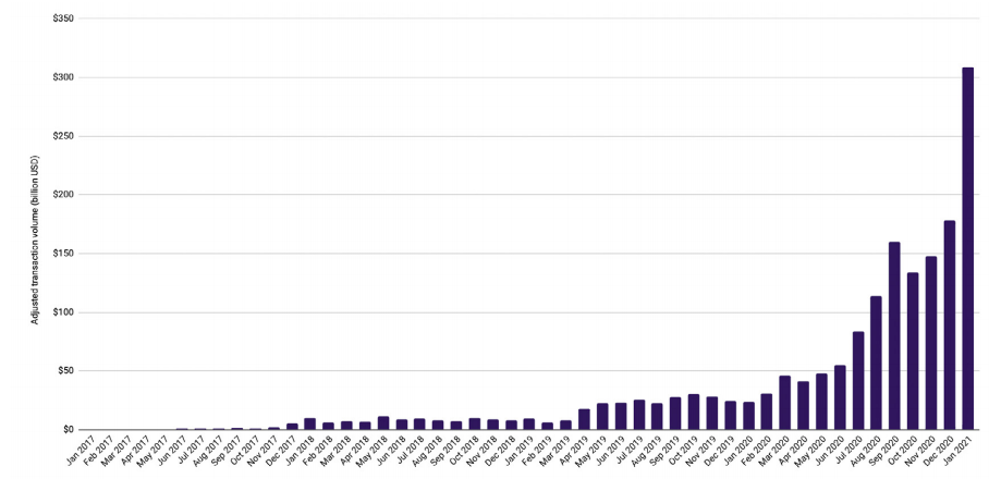 У USDT также самые высокие ежедневные объемы торгов среди всех криптовалют, включая биткоин. На его долю приходится около 70% от общего объема торгов ВТС. В январе 2021 года объем продаж Tether составил $495 млрд, в то время как объем продаж отстающих от него стейблкоинов BUSD и USDC составил $58 млрд и $12 млрд соответственно. А объем торгов всех остальных стабильных монет составил менее $10 млрд.