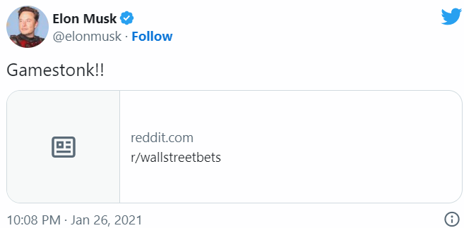 После твита Илона Маска с упоминанием GameStop акции компании за несколько минут выросли еще на 50%. Маск обыгрывает мем Stonks — каламбур со словом stonk — «бомбардировка»