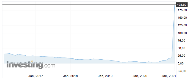 С ноября 2020 года акции GameStop стали медленно расти с $10.75, достигнув к концу года $18.8. К 14 января бумаги выросли почти до $40, к 25-му — до $76, а 28-го достигли пика в $494. Уже через несколько часов акции упали до $120, а сейчас стоят около $340.
